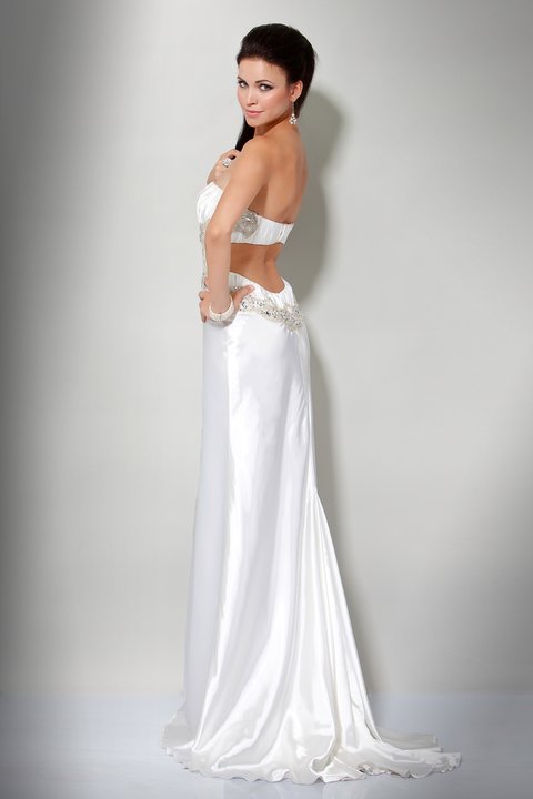 • Scalloped-Edge Neckline Strapless Pleated With Appliques Designer Evening Dress