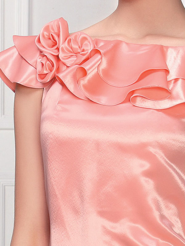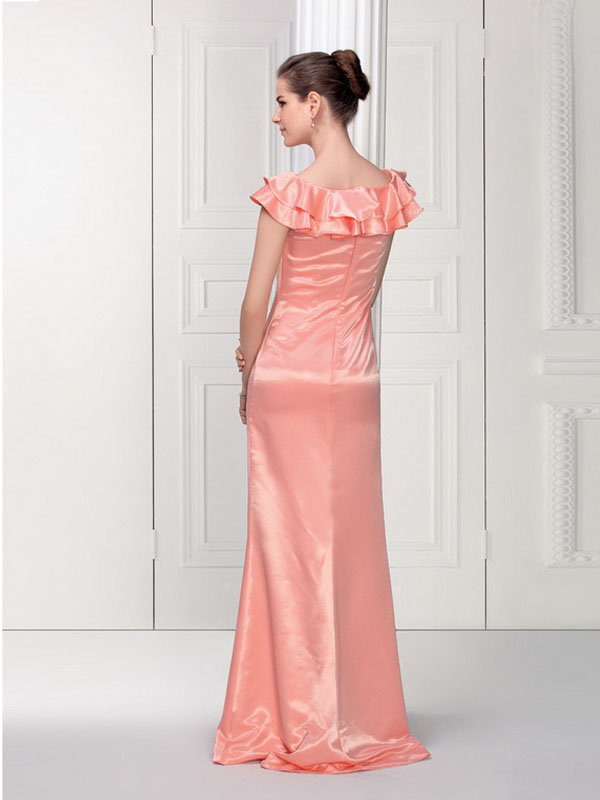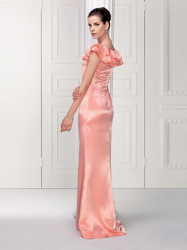 Description: Strikingly beautiful elastic satin evening gown. Ruffled edge to the bateau neckline adorn this dress in a shining manner. The straightly skirt stretch from the shoulder to the floor in a sweep train accents this gown.