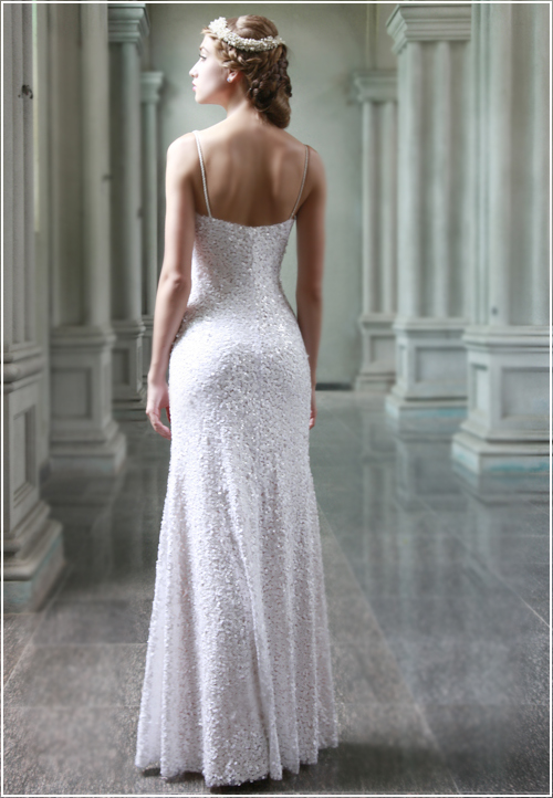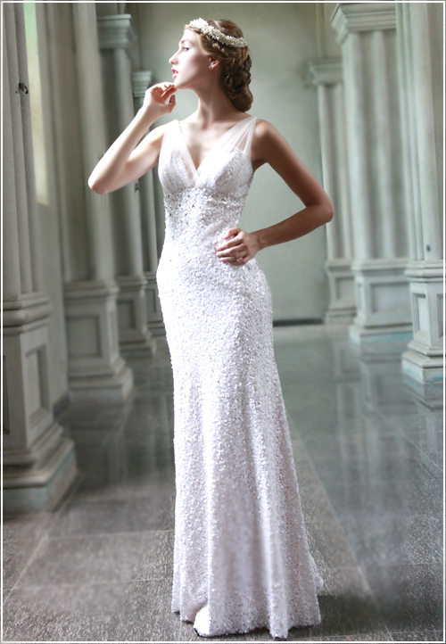 If it's your day to shine, this goddess-style gown is perfect for you. A V-neck top joins a fitted waistline before flowing into an open, Roman-style skirt. The entire dress is textured, giving off a look that is nothing short of heavenly. There is no train, so get ready to dance the night away with ease!