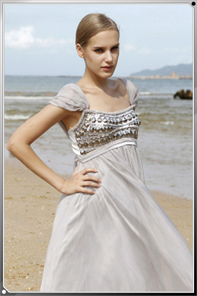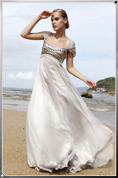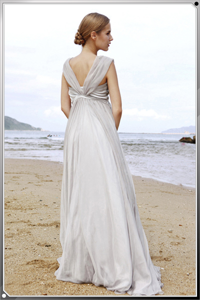 This empire-waisted modest evening dress is perfect to please the fashion-conscious without breaking the boundaries of tradition. Taking inspiration from ancient worlds, this clever style is elegant and graceful-perfect as a bridesmaid dress or prom or homecoming gown.