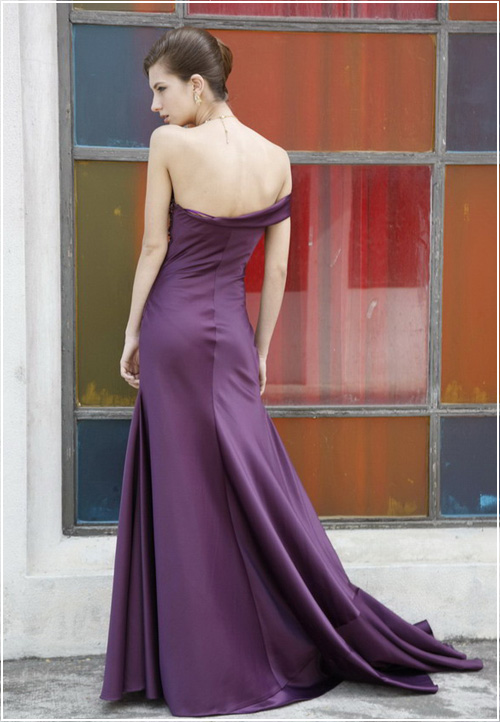 Whether you're leading a bridal party or just searching for the perfect purple evening dresses to suit your tastes, this satin gown with miniature train is delightful. Without overdoing it, the simple design on the evening dress and intricate embellishments on the bodice make for a classy and glamorous look.