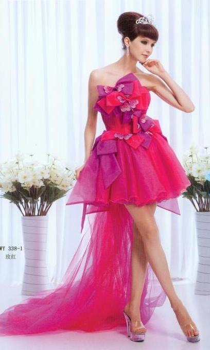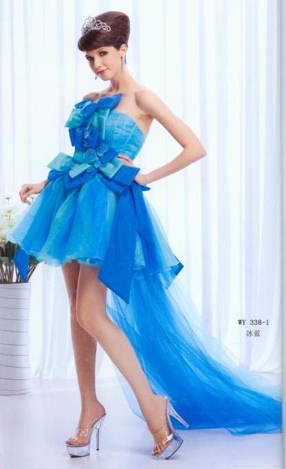 Whatever the occasion may be, this short dress is extremely versatile. Whether it's prom, homecoming, a formal or even informal event, this dress is perfect. This dress is purely the feminine with the short dress, long train, and plenty of bows. Pick your color- orange, rosy, or ice-blue- and match with a pair of sky high heels for the ultimate look.