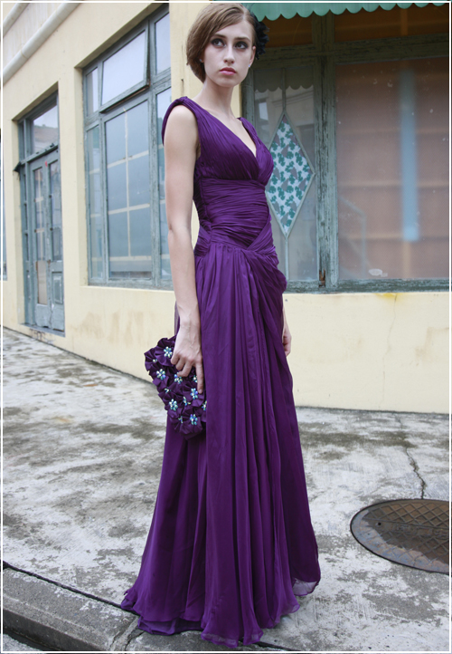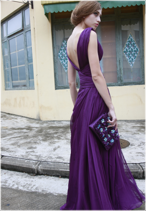 This electric purple bridesmaid dress is alluring to the eye. The sharp V-neck and plunging scoop-back design add to the overall fashion and style of this elegant, floor-length bridesmaid gown option. Front is bustled slightly to add uniqueness to a simple design.