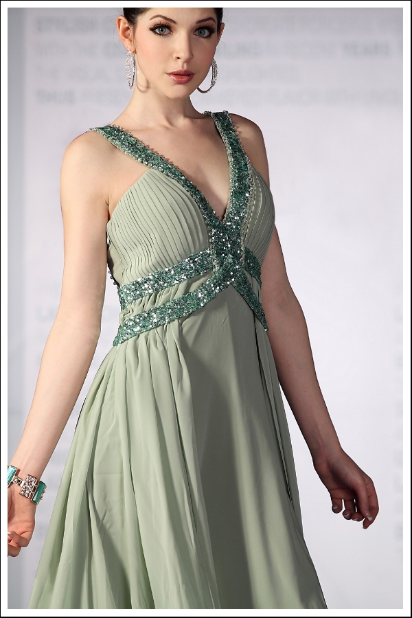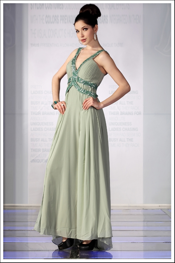 Skip and dance in this Indian-inspired sage evening gown. The V-neck and trimmed bodice are sweet and sexy, while the open layers of flowing chiffon place an exclamation point on the overall look of this evening gown. A great homecoming, prom, bridesmaid, or charity event gown selection.