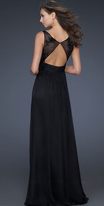 • V Neck Double Straps With Appliques Waist Pleated Floor Length Connection In The Back Black Evening Dress