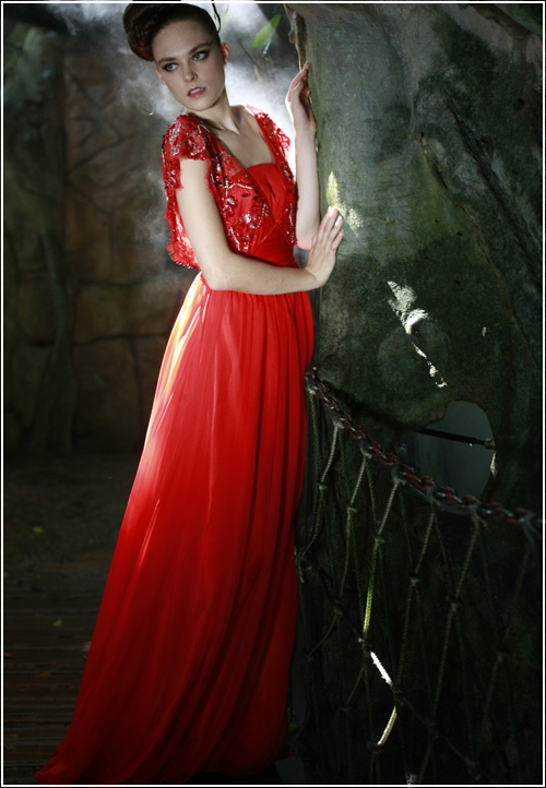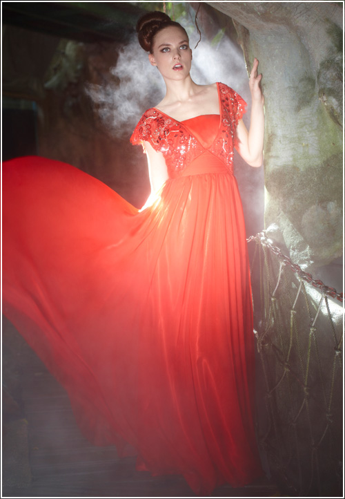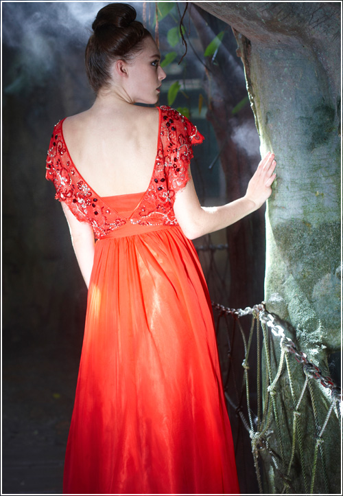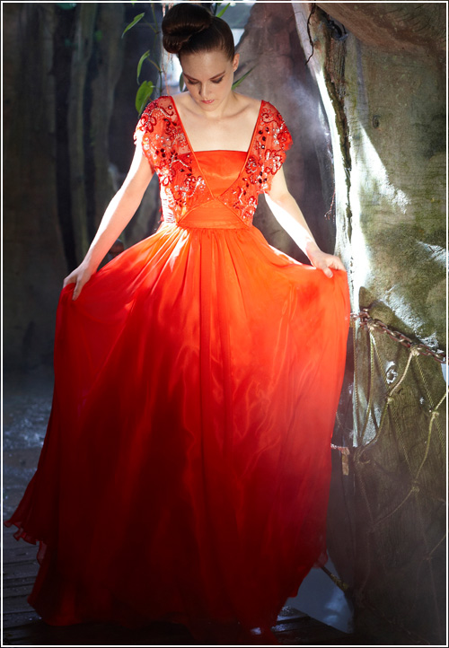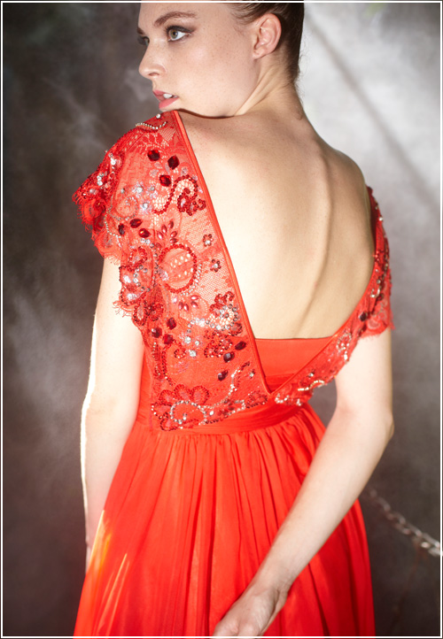 A modern version of a 1930's style dress, this silk red orange evening formal wear is tasteful and refined. Wide beaded straps slip toward the edge of the shoulder. The ornate beading and design adds an ornamental feel to this floor length gown.