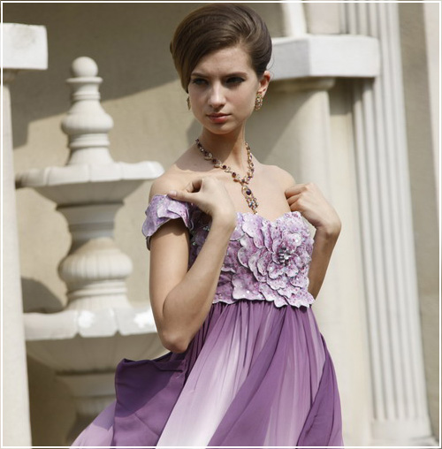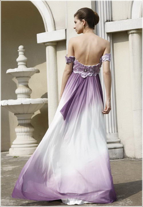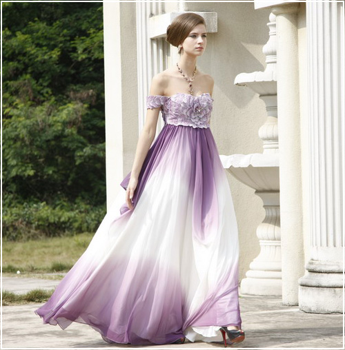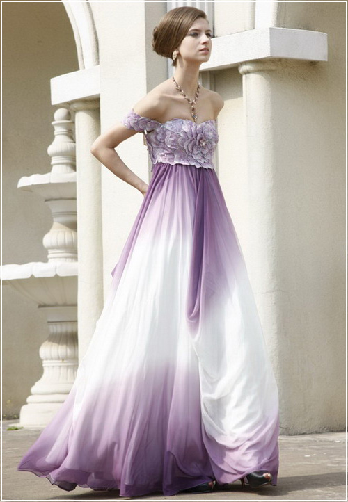 Alluring and comfortable, this elegant off-shoulder violet purple evening dress is a luxurious choice. The elegant flowers, empire waistline, and flowing chiffon in purple and white give the front view a regal look with the dramatic low-line on the backside. Great as a formal dinner or ball gown or a prom dress.