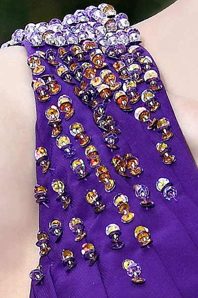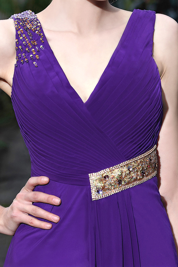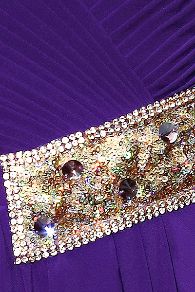 Mesmerize the crowd with this stunning violet V-neck gown. The sparkling embellishments shine like treasures as they hug your curves above the simple, flowing formal skirt. If you want to make a stunning impression at your next formal event, consider this formalwear selection.
