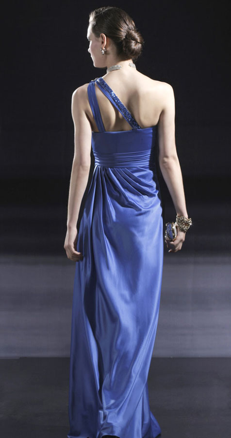 Everyone will stand frozen as you strut past in this dramatic water and ice kissed evening gown. The glamorous one-shoulder neck meets a wrapped waist and asymmetrical hip line, while the classic silky fabric flows to the floor in formal fashion.