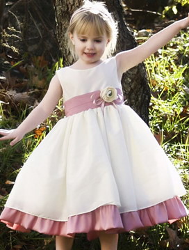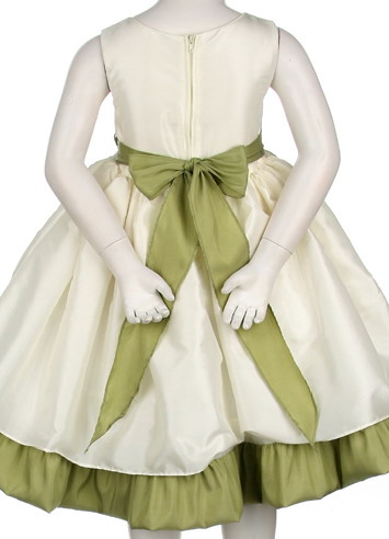 This pretty tea length dress is made of crisp party taffeta. The bodice and skirt is fully lined in a solid ivory color. The irremovable sash and trim is in a beautiful sage. The bubble style dress has a fluffy layer of netting crinoline sealed inside the lining. Bodice zips in the back and floral embellisment at the waist is removable to prevent damage during cleaning. Care instructions state that this dress is machine washable, but hang to dry.