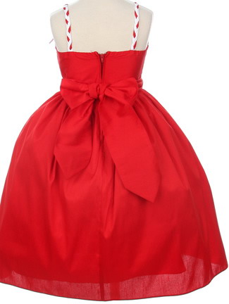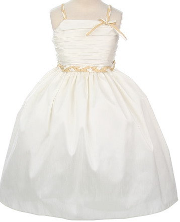 This beautiful taffeta dress is fully lined. The waist embellishment has a matching design to the braided shoulder straps. The bodice is rouched for texture and the skirt has a built in crinoline layer for added fullness. The dress zips in the back and an attached sash ties for a perfect fit.