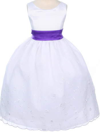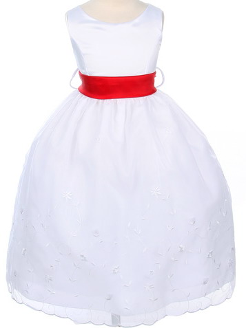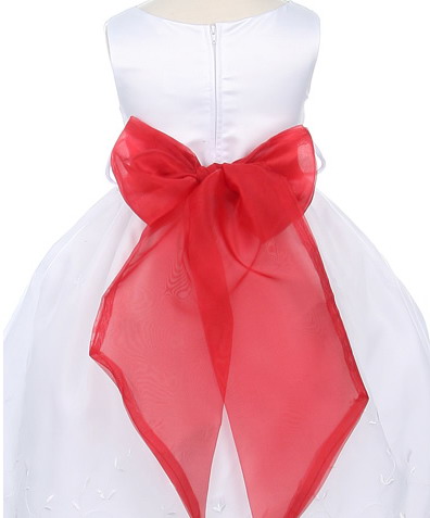 The MB200 white organza embroidered dress is a simple classic design popular for its ornate floral embroidery. The bodice is fully lined in heavy wedding quality matte satin with a zipper back. The multi layered skirt has a top layer of white embroidered floral design over organza. Organza is a shiny shimmery translucent fabric popular in wedding flower girl dresses. The delicate embroidery creates a contrast and texture over the shimmery top layer. The second layer is white satin to give the stark pure white back ground to the embroidery, and finally, the bottom layer is a satin slip with a lining of crinoline netting that can be fluffed for added fullness. The attached slip can be fluffed and held in place with spray starch to create the full look in the image. For an even more full bell in the skirt we would recommend a full hoop petti coat under the dress. This garment is Made in America. We carry over 26 color sashes in the organza fabric and you can have any of these added to your dress.