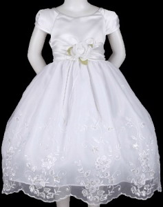 This is a very pretty satin and lace dress with an embroidered crystal organza skirt. Skirt is multi layered with an attached slip with a built in layer of crinoline for added fullness. The satin bodice is fully lined with a bow sas in thhe back over a zipper. Flower pin is removable to prevent damage during cleaning.