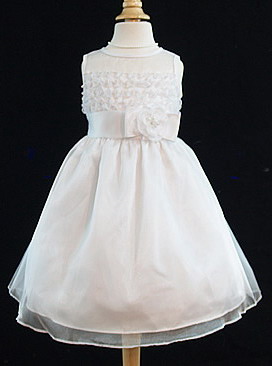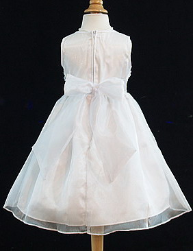 This pretty delicate looking white organza dress is a tea length dress. The back of the bodice zips and has a white organza sash attached that ties in a bow over the back of the zipper. This is great to take in any extra fabric at the waist for a slender child without the need to make any alterations for her walk down the aisle. The dress is fully lined with three layers at the skirt. The top layer is the shimmery organza. The center layer is a light weight satin and the under layer is also made of satin with a built in piece of crinoline netting for a little lift. The crinoline lies between the satin layers so the heavy netting never touches her knees. The front of the bodice is covered in a tiered ruffle lace and the neck and shoulder line has a satin piping. The bow shown in the picture is removable. This dress is a perfect formal dress for a flower girl, communion, or holy ceremony.