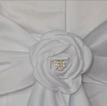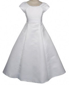 This is a beautiful long gown with cap sleeves and a waist sash the follows to the back with a rolled rose over a bow. The waist sash is not removable, but the rose and bow are removable. The dress is fully lined with an additional attached crinoline netting and satin slip.