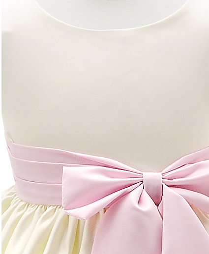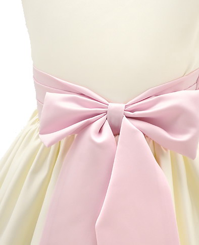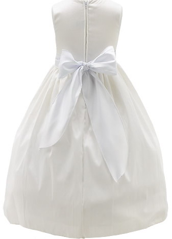 Satin flower girl dress, fully lined with a white. Pleating and a crinoline attached slip created a look of added fullness. Fat satin bow sash ties in the back over a bodice zipper. The sash on this style dress is not removable. This pretty dress has an attached slip with a layer of fluffy crinoline. An additional under layer of satin lining is added to keep the scratchy feeling off her knees.Detail images show this style in ivory and pink.