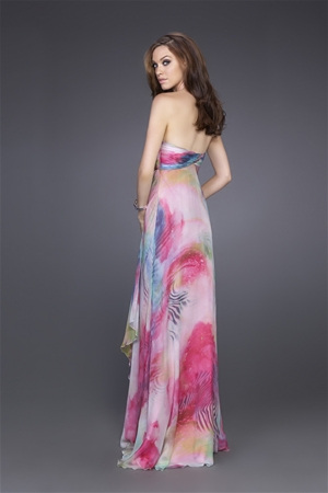 Gorgeous pastel animal print strapless gown with sweetheart neckline. There is a beaded broach on the side which creates a slight gathered effect.