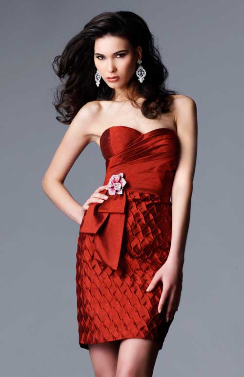 Clarisse cocktail dress 1404 is the perfect short prom dress for any occasion and is available in ocean blue, cognac or basic black! The draped waistline with side bow and brooch accent will cinch your figure while the sweetheart neckline draws attention up to your face. Dress it up with some funky high heels for your homecoming dance! Elegant and beautiful, this form fitting cocktail dress is divine in black, royal blue, or cognac red. It is great for a semi-formal dance like homecoming, or for a more formal event like your prom. The strapless bodice features a graceful heart shaped neckline, which tops a textured skirt that lands above the knees. The waist is accented with a sash of the same color as the dress and an embellished floret set to the side.