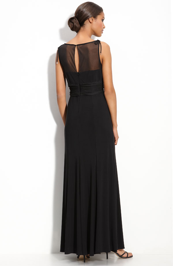 Bead-detailed ties top the mesh bodice of a fluid jersey gown, wrapped at the waistline by crisscrossed ruching to define the figure.