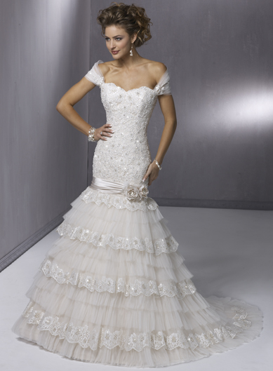 Our fashion style of wedding dress combines all the essence of the traditional beauty and combines the extraordinary modern elements. Fancy silhouette with charming elements creates a fantastic look. Sumptuous wedding dresses appreciate soft neckline dotted with glittering embroidery and beaded motifs over the pleated bodice. Natural waistline reveals the full skirt running down to the floor with a graceful chapel train.