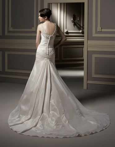 This kind of taffeta wedding dress features its mermaid design. There are beadings decorated around the body of the dress.The real goods will be 95% matched with the photo.