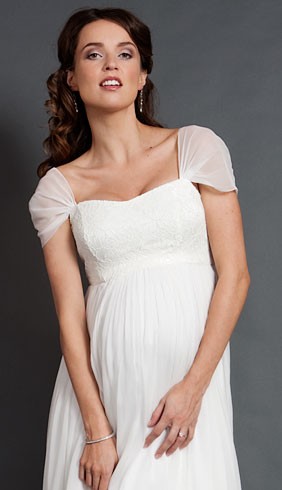 Description:This maternity wedding gown succeeds on exquisite cap-sleeves and simple elegant empire silhouette.It is also boned and lined in first-class handwork.You can not only order standard size and picture color ,but also custom size and other color in our color chart you preffer.