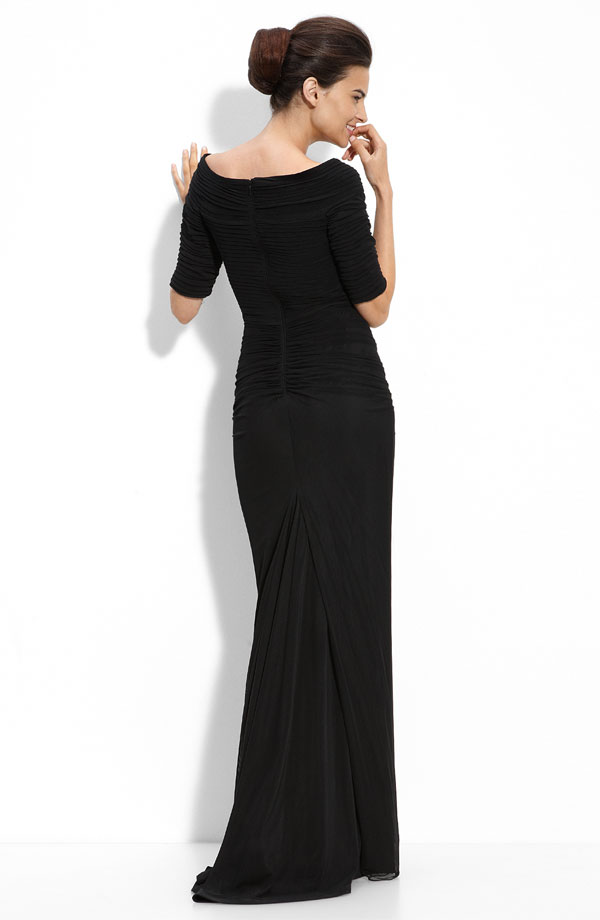 Ruched elbow-length sleeves.