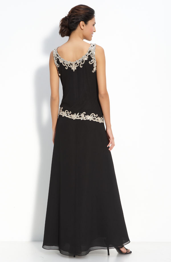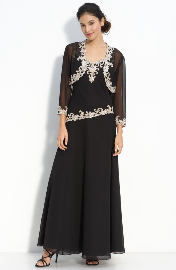 Lavish beading accents a sleeveless dress styled with an angled drop waist. A sheer bolero with three-quarter-length sleeves is finished with matching beadwork.