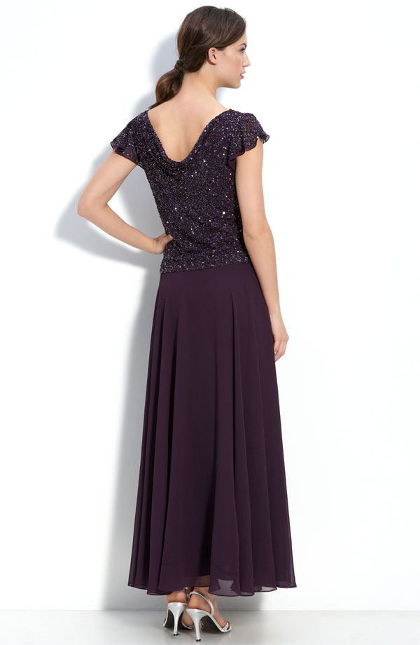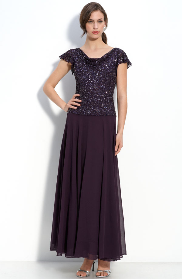 Chiffon fashions a floor-sweeping dress topped with a bead- and sequin-embellished bodice, gently draped at both the front and back neck. The flowing A-line skirt is visually balanced by sheer, fluttering cap sleeves.