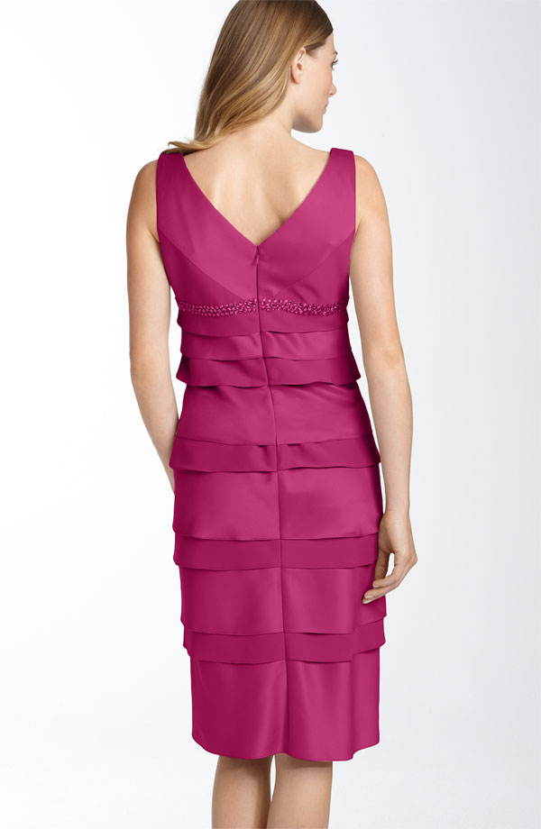 Alternating tiers of chiffon and satin fashion the tulip-hemmed skirt on an elegant V-neck dress, wrapped at the Empire waistline by sparkling beads. The matching chiffon shawl provides sheer coverage.