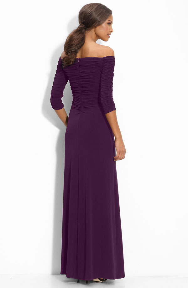 A ruched off-shoulder bodice begins the elegant style of a three-quarter-sleeve gown in fluid jersey.