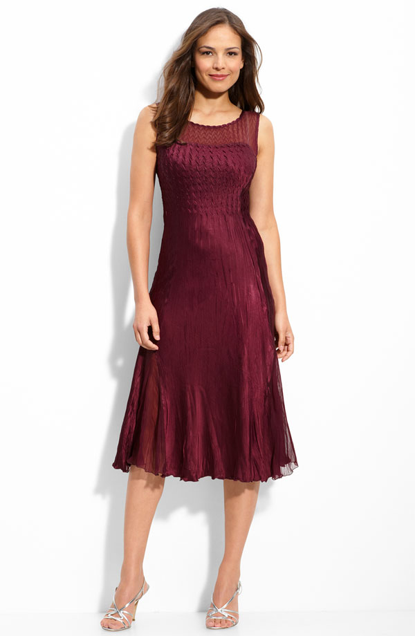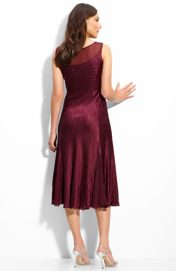 Diamond-pleated chiffon tops a lustrous sleeveless dress fashioned with sheer insets at the hemline. A beautifully jeweled snap secures the V-neck jacket, which features sheer three-quarter-length sleeves and a tiered, raw-edge hem.