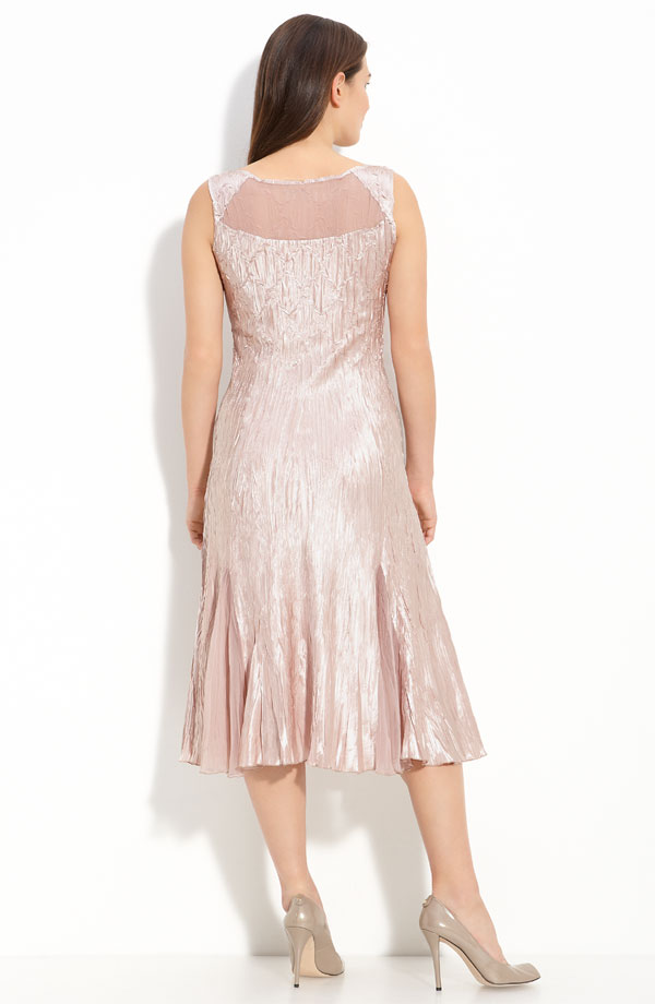 Sparkling beads outline the front of a tiered chiffon jacket that layers over a beautifully pleated and textured charmeuse dress fashioned with sheer chiffon at the neckline.