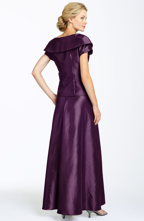 Elegant taffeta set features a lovely wrap top over a full, A-line skirt. The wide portrait collar perfectly frames the face, while pleating at the waistline flatters the figure.