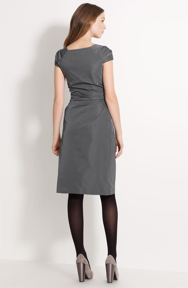 An off-center notch cuts into the neckline of a lustrous radzimir dress with pleated folds along the cap sleeves and at one side of the waist.