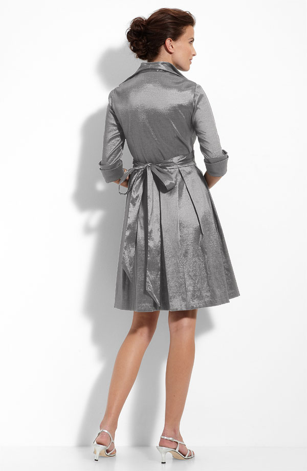 Rhinestone buttons sparkle on the front of a three-quarter-sleeve shirtdress in lustrous taffeta. The double-layered collar perfectly frames the face, while attached ties at the waist cinch the silhouette.