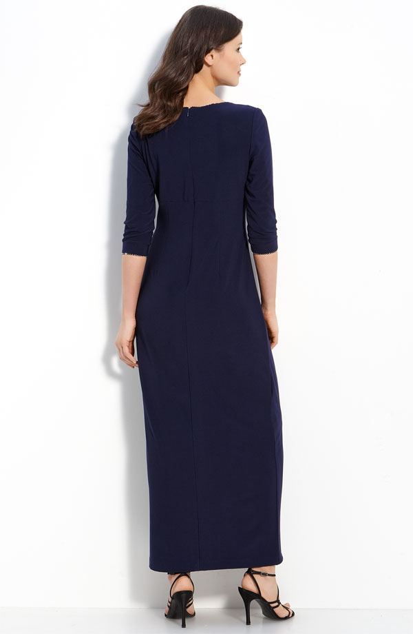 Narrow rhinestone trim around the surplice neckline and cuffs adds subtle sparkle to a sophisticated stretch-jersey gown with a faux-wrap skirt that creates flattering draping and gathers at the waist.