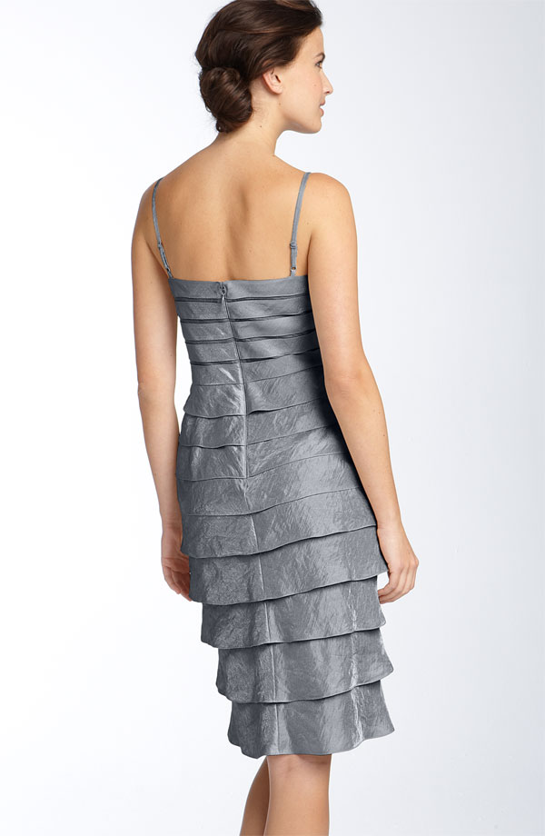 Overlapping tiers of shimmering hammered satin fashion the skirt of an elegant sheath dress, detailed with tonal mesh insets at the V-neck bodice. The matching bolero is styled with a high collar and split three-quarter-length sleeves.