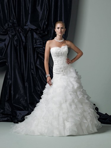 Shipping Weight: 3.5KgStrapless organza ball gown with softly curved neckline, beaded re-embroidred lace bodice accented with three-dimensional lace flowers, asymmetrical dropped waistline, multi-tiered full ruffle skirt with train.