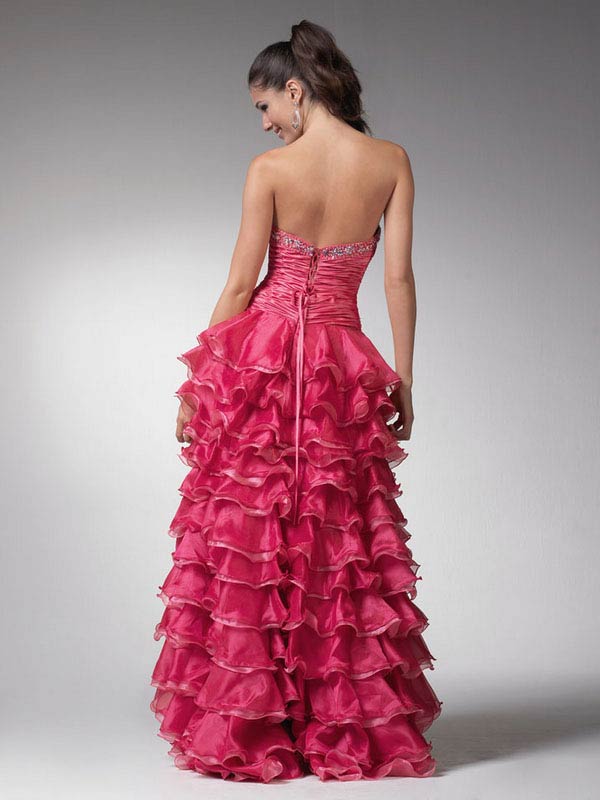This is a excerlant evening gown that make shining all the ning in any special occasion. The sweetheart necjline withbeading decorated at the upper bustline and then stretching to the center of the front bodice. It is so special and exquisite that everyone will love it at the first glance. The ruching bodice with strips corset at the low back make you look sexy. The most eye-catching of this prom gown is the asymmetrcial length of the layered organza made skirt with sweep train. It will certainly take others breath away in astonishment.