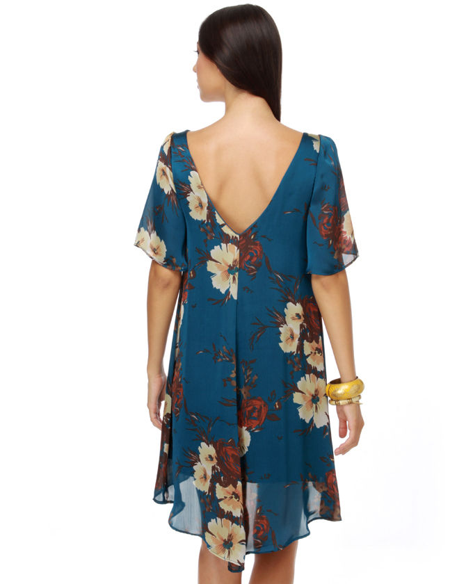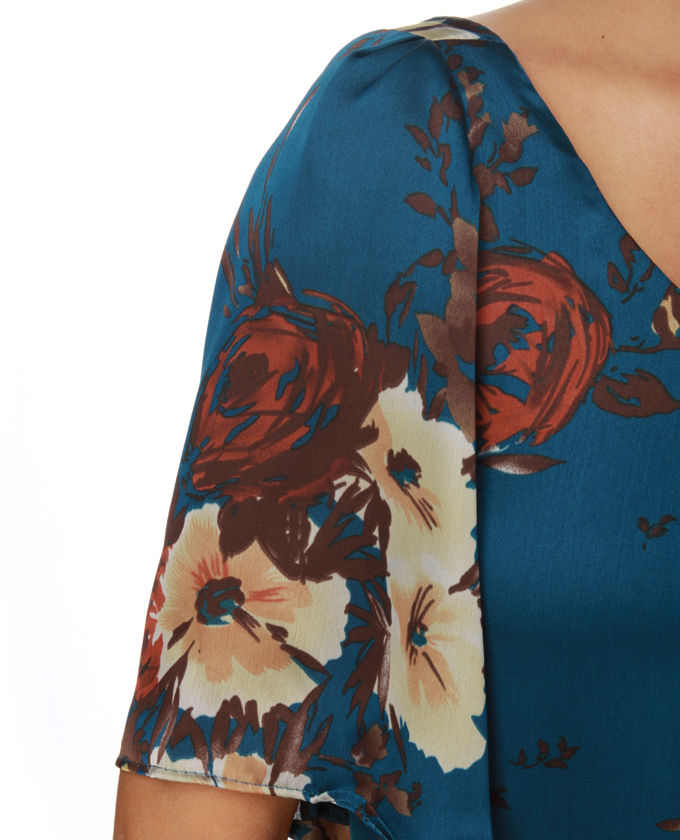 As the early morning mister system moves above the ground, gather your brushes and canvas and head out to make a masterpiece in the Artist in the Wood Blue Floral Dress. Soft bouquets in shades of lotion, orange, and yellow slumber against a print of brown branches and vibrant blue satin. Bell sleeves plus v-background meet high-low hem and huge cut for a blend of modern day and marvelous! Fully lined. Model is wearing a compact. Small measures 33" shoulder to be able to hem, 5" longer in back. 13" sleeve (coming from neckline). 36" bust. 34" waist. 100% Rayon. Hand Wash Cold. Created using Love in the U.S.A.