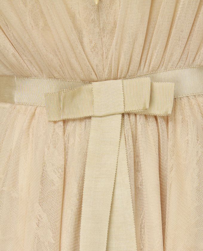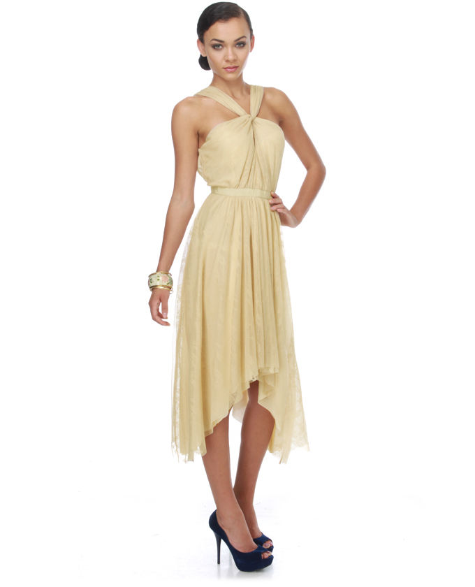 Like a beautiful old house tucked into the verdant Vermont hillsides, a Aryn K Maple Mansions Beige Wide lace top Dress is graceful and beautiful. Lacy mesh material will be supple and stretchy and also basks in the color of whipped honey. Garbled neckline has front keyhole cracking open and dips into a plunging back that is framed using a grosgrain ribbon waistband. Back ribbon detaches with two snaps plus asymmetrical hemline falls longer at the sides. Bottom of skirts has an un-hemmed, raw edge this curls under. Fully covered. Model is wearing the size small. Small procedures 37" shoulder to hem; 11" more time at sides. 27" Waist. 34" Bust line (relaxed). 100% Polyester. Dry Fresh Only. Imported.