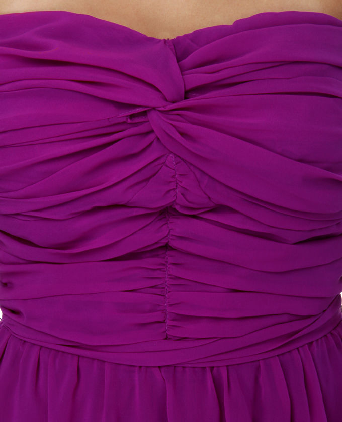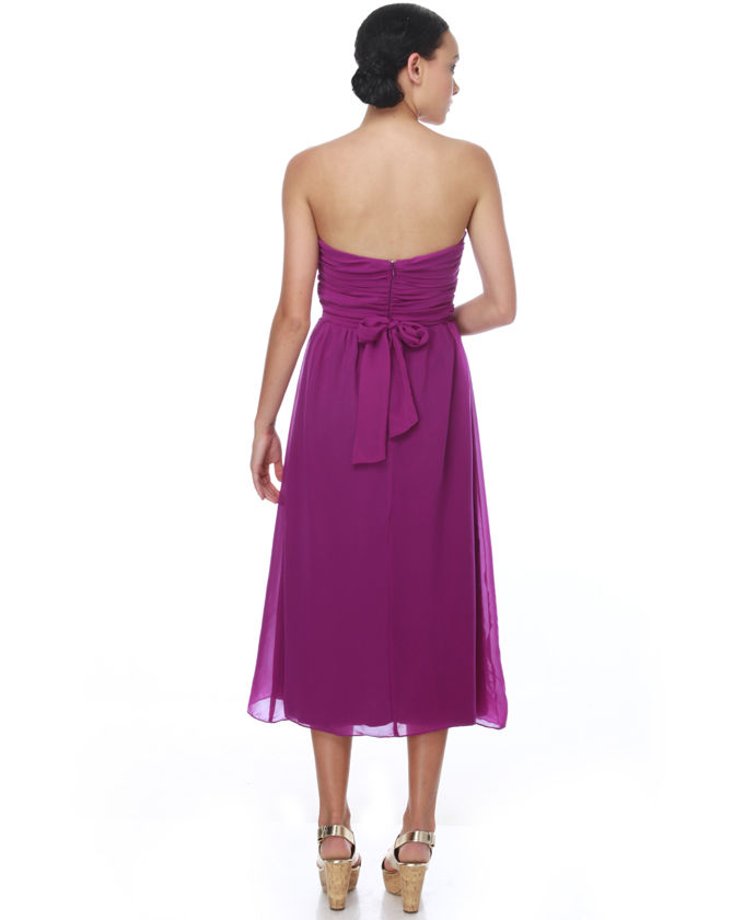 Dances, weddings, and functions, oh my! Tackle those future dates with confidence in the Big event Purple Strapless Dress. Brilliant grape purple chiffon is ruched and smoothly twisted across strapless bodice and transitions into a bridesmaid-worthy mid-calf length dress. Belted sash accents a fixed waistline. Invisible back zipper/hook hold. Dress is fully lined. Type is wearing a measurements small. Small measures 41" extended. 25" waist. 30" bust. Shell: 100% Rayon. Lining: 97% Polyester, 3% Spandex. Hand Wash Cold. Imported.