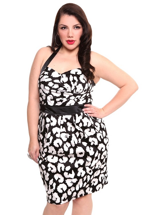 Get the party started right in this chic black and white print halter dress. Features front pockets with empire waist, sweetheart neckline and tie-back sash. Elastic back with back-zip entry.