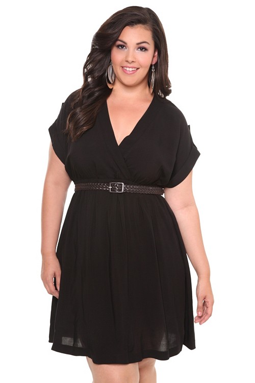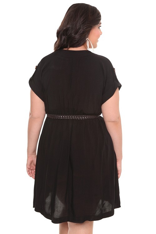 Internet exclusive! Look chic and stunning in this classic cool black challis dress. Features empire waist with button tab sleeves and v-neck. Perk alert: Comes with stylish brown braided belt to complete your fab look!