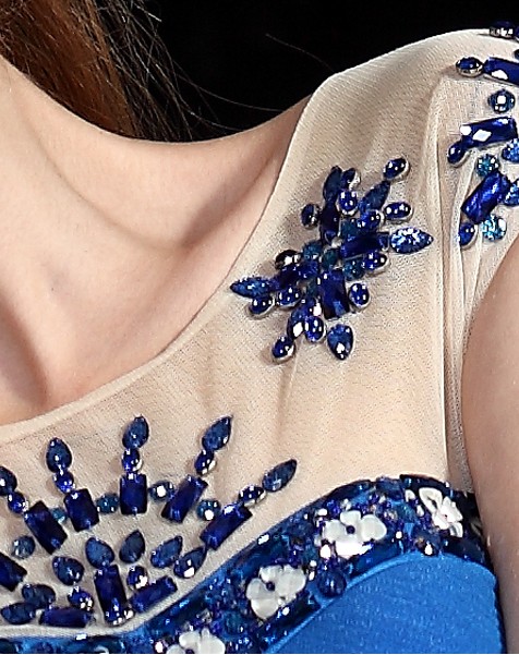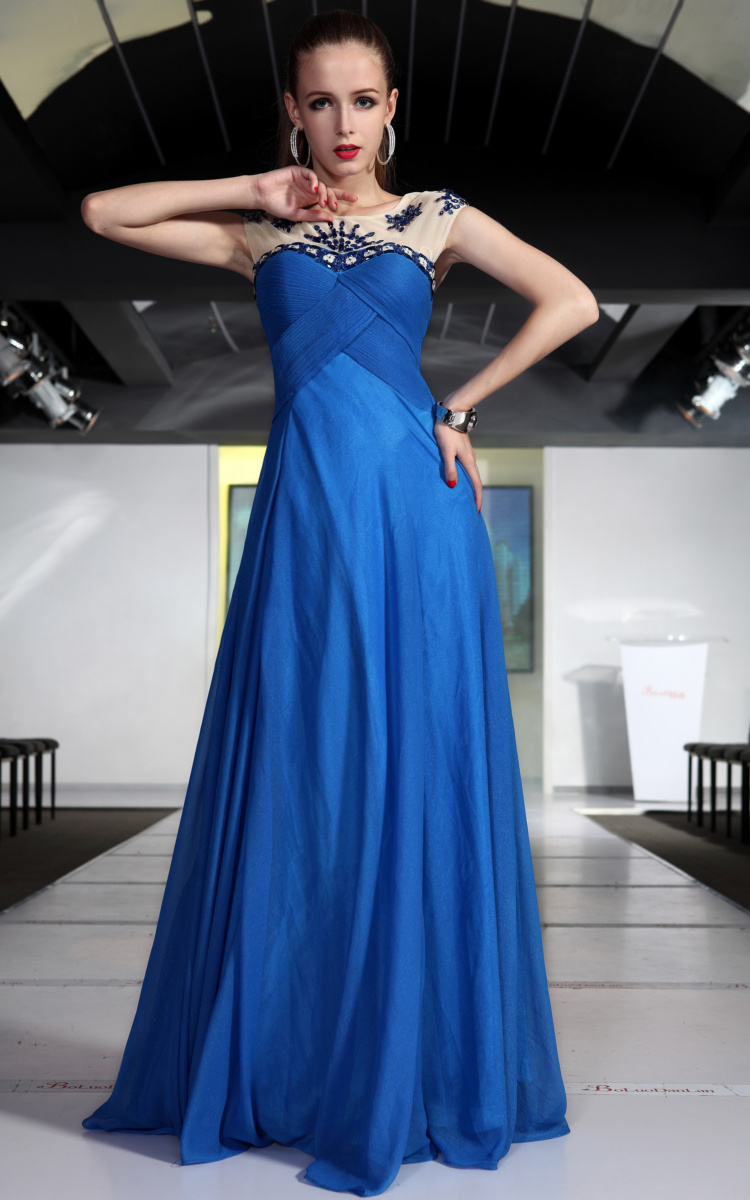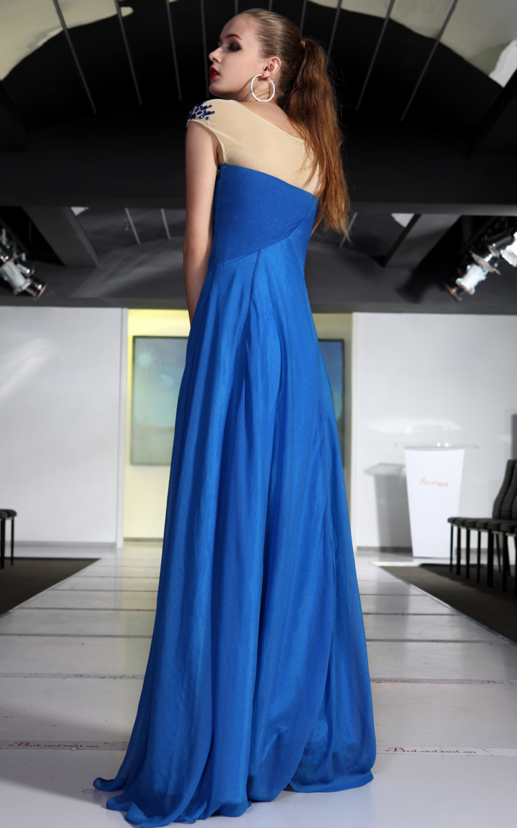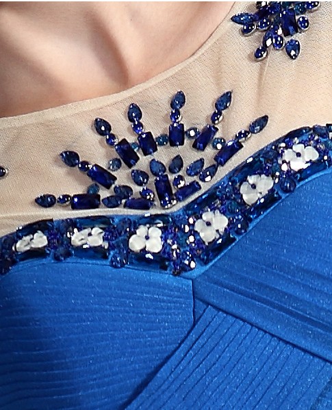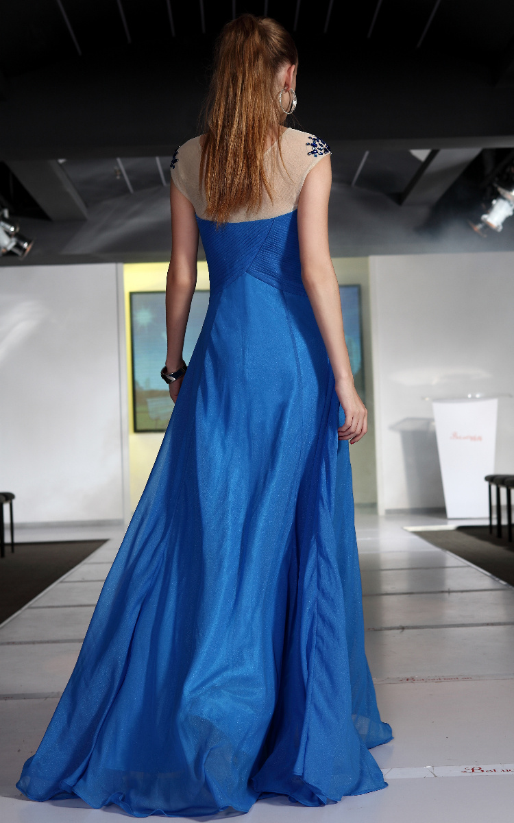 This sleek blue gown has the modest of all looks, but still leaving the woman looking sexy and confident. The dress has a sweetheart neck line, but then there is a see through mesh fabric from the top of the blue dress, going to the back when the dress starts again. Throughout this mesh fabric there are blue accenting beads.