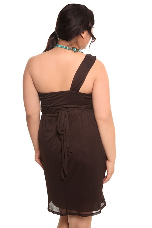 Deck it out in effortless feminine style in this brown mesh one shoulder dress. Features bronze and turquoise bead trim on shoulder straps, empire waist with ruch detail.