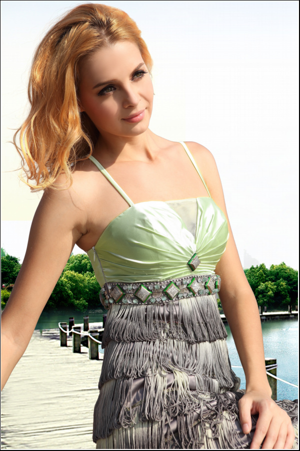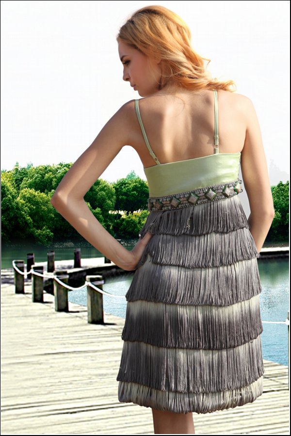 Dare to wear diamonds with this mint green and crepe short cocktail dress. The spaghetti-strap tops add just the right support to the bodice, and the diamond waistband gives way to layers of faded black crepe that hits at mid-thigh on most women.