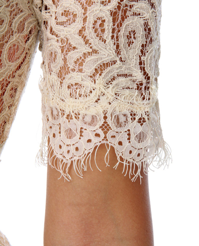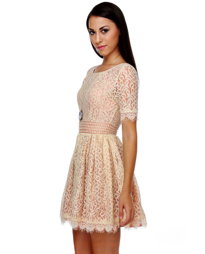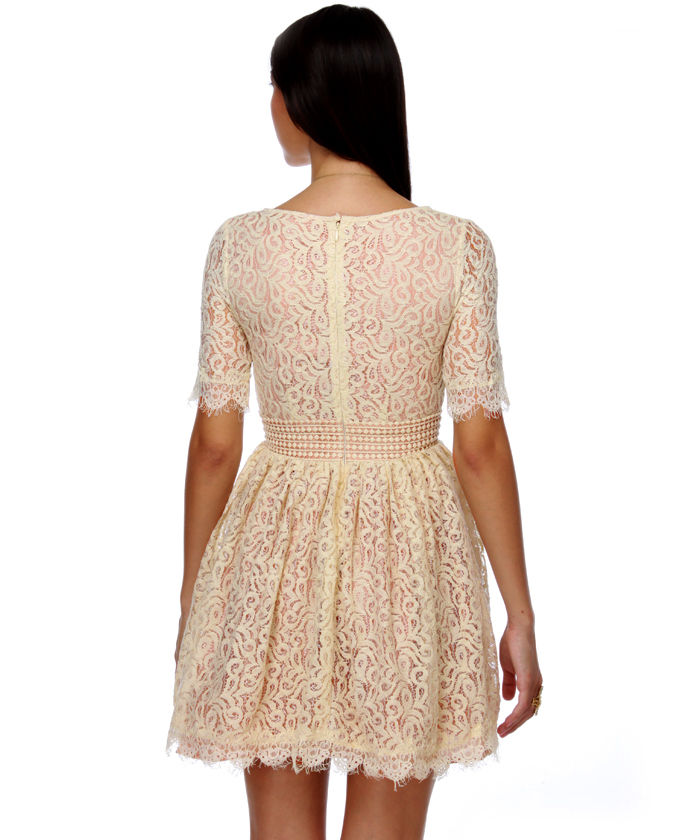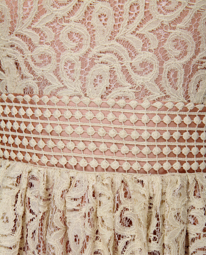 Like the sweet woman who lent it back, the Darling Amelia Ivory Wide lace top Dress is charming and delightful! Magnificent sheer cream lace includes a scoop neck bodice as well as fringe-hemmed short sleeves, while complementing lace skirt descends from a diverse band of dotted lace around waistband. Matching fringe wide lace top at hem rests on a hidden row of tulle. Peekaboo white lining makes for a a little wild finish! Hidden back zipper/hook form. Fully lined in blush pink satin. Model is wearing size X-Small. XS measures 33" get to hem. 14" sleeve (from neck line). 26" waist. 32" bust. Shell: 70% 100 % cotton, 30% Nylon. Polyester Lining. Reduce: Cotton/Nylon. Hand Wash Separately. Imported.