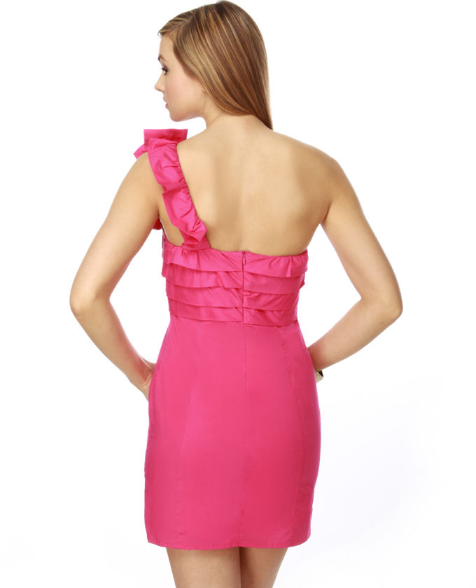 You'll never miss the mark while in the Deft Precision Pink Dress. Features diagonally pleated portions around the bust and a ruffle which wraps around one get and ends in a attractive applique flower. Dress is lined using an invisible back zipper drawing a line under. Small measures 32" from shoulder to hem. 28" bust. 97% Organic cotton. 3% Spandex. Hand Wash Cold. Brought in. Makes for a great party dress, an incredible dress to wear to the dance or the dresses you dress your items are often in!
